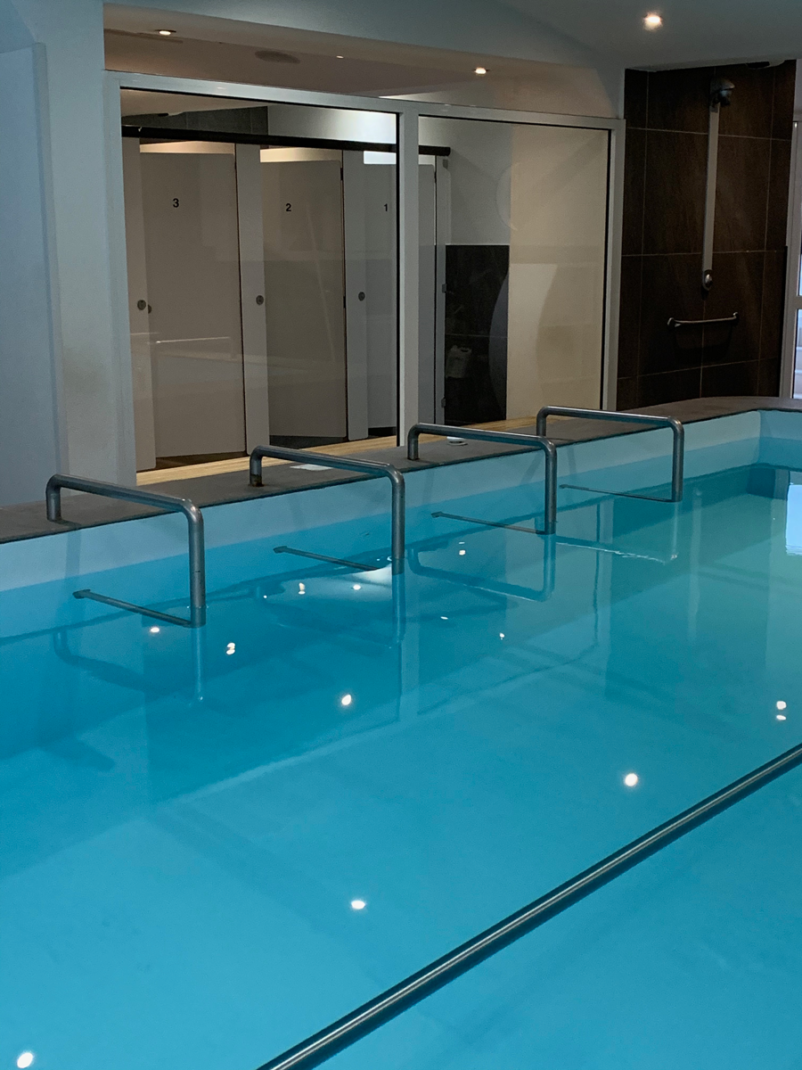Notre espace de balnéothérapie est composé de 6 postes de rééducation, situés dans un bassin chauffé de 35 m2 et 1,1 m de profondeur.